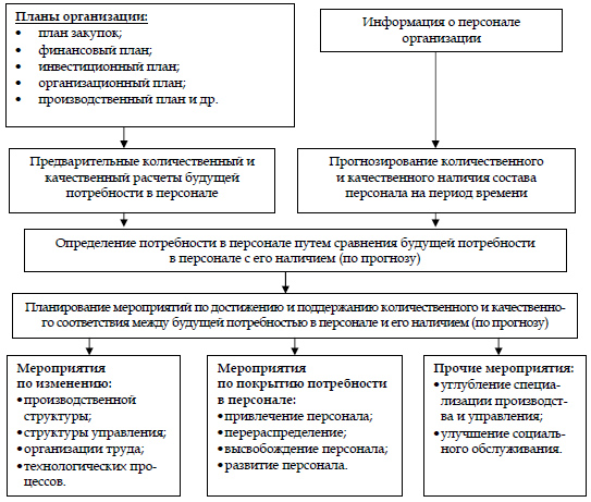 Начальной ступенью процесса кадрового планирования является планирование потребности в персонале. Оно базируется на данных об имеющихся и запланированных рабочих местах, плане проведения организационно-технических мероприятий, штатном расписании и плане замещения вакантных должностей (рис. 3).