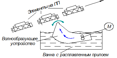 е) пайка элементов на ПП: в серийном производстве – пайка погружением, когда ПП с элементами погружается в расплавленный припой или пайка волной припоя: