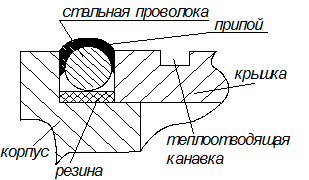 В зазоре между крышкой и стенками корпуса размещают прокладку из термостойкой резины, которая не позволяет проникать парам припоя и флюса внутрь корпуса. Далее на резину кладут стальную проволоку диаметром 0,8 мм и весь шов пропаивают ПОС-61.