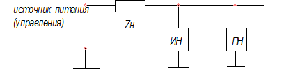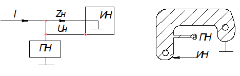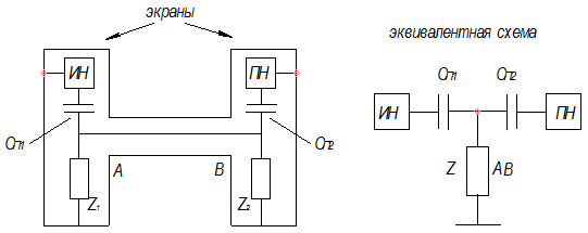В – наводки через провод связи. Емкостные и индуктивные (С и L) наводки могут возникать и при отсутствии непосредственной связи через поля между ними (ИН и ПН). Паразитные наводки от ИН к ПН, соединенных между собой проводами, могут передаваться по проводам связи. Провод имеет емкость СП и взаимоиндукцию МП по отношению к ИН и ПН. Величина этой связи определяется как величинами СП1, СП2, МП1, МП2, так и величиной полного сопротивления Z, которое имеет провод относительно корпуса.