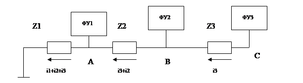 Наибольший уровень помех при общей последовательно включенной шине «земля». Чем дальше удалена точка заземления от опорной, тем выше ее потенциал. Эту систему не следует применять для цепей с большим разбросом потребляемой мощности, так как мощные функциональные узлы (ФУ) создают большие возвратные токи заземления, которые могут влиять на слаботочные ФУ. Слоботочные ФУ следует подключать как можно ближе к точке опорного заземления.