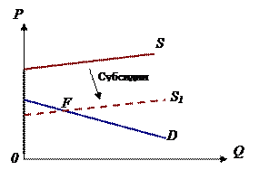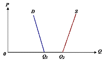Подобная ситуация означает, что производство данного товара технически возможно, однако спроса на него нет. В этих условиях могут оказаться производители новой и дорогой продукции. Если государство просубсидирует этих производителей и линия предложения опустится (как это изображено пунктирной линией), то покупатели найдутся и их будет тем больше, чем крупнее объем дотаций. Со временем производители могут увеличить эффективность своего производства и необходимость в дотациях отпадет, так как при увеличении эффективности производства линия предложения смещается вправо и вниз.