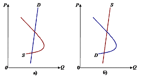 Однако ситуация изменится, если линии спроса и предложения теряют свои традиционные свойства. На рис. 5 показаны ситуации двойного равновесия. Левый график характерен для ситуации на рынке труда, а правый – частный вид ситуации эффекта сноба.