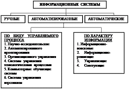 В зависимости от степени развития информационной технологии и автоматизации процессов обработки информации различают: ручные, автоматизированные и автоматические информационные системы.