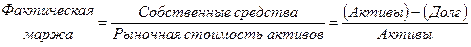 и при цене акции ниже 11 руб. их суммарная (за 100 акций) залоговая стоимость станет ниже суммы долга банку (с учетом процента). Если в этих условиях инвестор будет не в состоянии погасить задолженность, то долг банку будет выплачивать брокер. Чтобы обезопасить себя от подобных коллизий, брокер ежедневно оценивает финансовое состояние клиента. Для этих целей брокер использует специальную величину – фактическую маржу