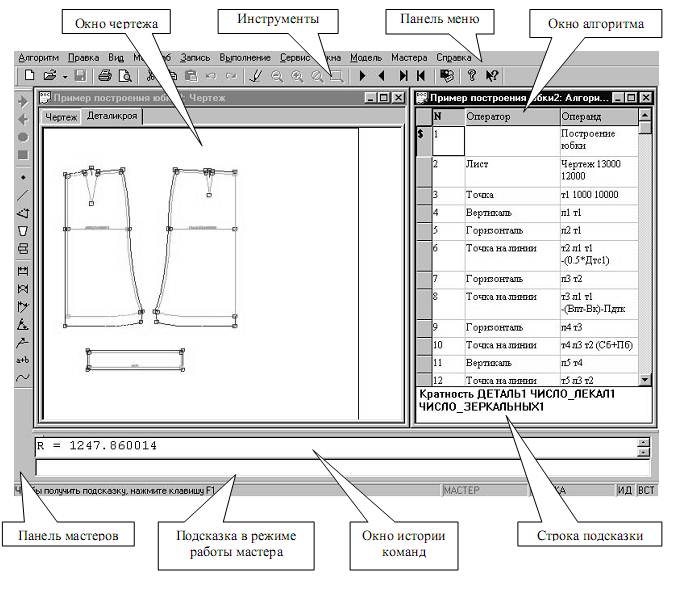 Окно алгоритма – где пользователь записывает алгоритм построения конструкции деталей одежды и приемы моделирования; каждая строка состоит из оператора и операндов.
