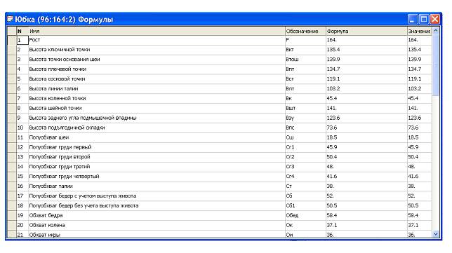 Загруженные в систему размерные признаки и прибавки хранятся в пункте меню «Окна» в «Окне всех формул». Вызвав данное окно осуществляют просмотр введенных значений и, если необходимо, изменяют их.