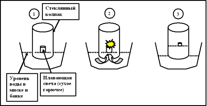 Оборудование: стаканы химические, спички, штатив с пробирками, миска с водой, свеча.