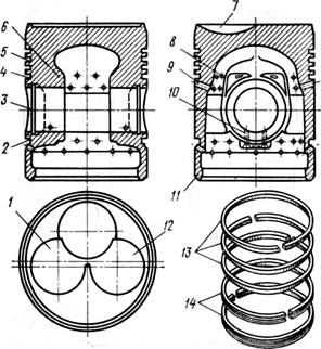 Рис. 5. Поршень и кольца: 1, 12 — выточка под впускной клапан; 2 —канавка под нижнее маслосъемное кольцо; 3 — выточка под стопорное кольцо; 4 — канавка под верхнее масло- съемное кольцо; 5 — канавки под компрессионные кольца; 6—бобышка; 7 — камера сгорания; 8, 9 — дренажные отверстия; 10 — отверстия для подвода масла к пальцу; 11 — поясок для подгонки поршней по массе; 13 — компрессионные и 14 — маслосъемные кольца