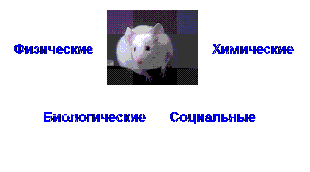 Физических (температура, атмосферное давление, освещенность…), химических (содержание О2, мочевины, токсикантов в воде, воздухе ….). биологических (инфекция, раны, беременность…), социальных (пернаселение в клетке, соседство животных других видов…).