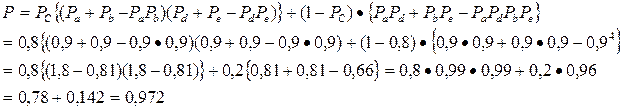 5. В полученную формулу проставим числовые значения вероятностей состояния элементов и определим вероятность РС состояния сложного изделия.