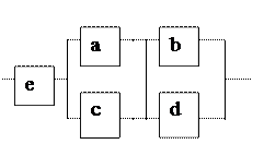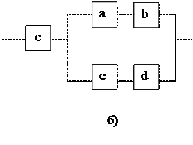 Но элемент е может находиться в состоянии отказа. Тогда в исходной схеме его положения следует обозначить обрывом цепи. С учетом вероятности отказа элемента е получим схему (рис. 3.6 б). Схемы (рис. 3.6 а и б) - схемы заменяющие мостовую схему. Они значительно проще её по структуре.
