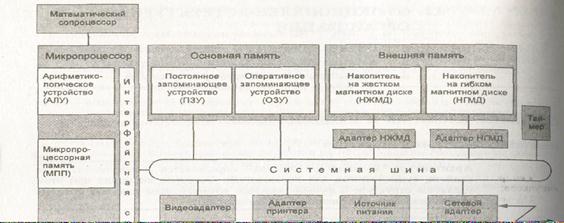 Основные компоненты архитектуры ЭВМ: микропроцессор, внутренняя (основная) память, внешняя память, устройства ввода и вывода информации и устройства передачи информации.