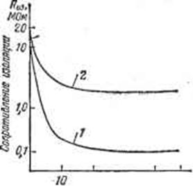 Применение специальных пропиточных составов позволяет поддерживать сопротивление изоляции на высоком уровне, несмотря на неблагоприятные условия. На рисунке 26 показано изменение сопротивления изоляции двигателей общего назначения 1 и влагоморозостойкого 2 исполнения.