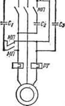 На рисунке 27 представлена одна из возможных схем такого устройства. При замкнутых контактах магнитного пускателя конденсаторы оказываются соединенными по схеме «треугольник» и служат компенсаторами реактивной мощности. При разомкнутых контактах конденсаторы оказываются соединенными последовательно с обмотками двигателя. Двигатель остается под напряжением. Небольшой ток, протекающий по обмоткам, подогревает их во время паузы, предотвращая увлажнение изоляции. Экспериментально установлено, что для поддержания сопротивления изоляции на допустимом уровне необходимо поддерживать превышение температуры обмоток над температурой окружающей среды в пределах 7—8. Как показали опыты, сопротивление изоляции двигателя АОЛ2-32-4 при температуре окружающей среды.20°С и влажности 100% без подогрева через 8—10 ч становится ниже нормы (менее 0,5 МОм), а с подогревом — не уменьшается ниже 2 МОм.