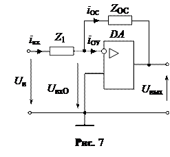 - при любом входном токе напряжение на инвертирующем и неинвертирующем входе ОУ будет стремиться к нулю. Тогда при любых входных сигналах разность напряжений между инвертирующим и неинвертирующим входами стремится к нулю. Это подтверждает сделанный ранее вывод и том, что ОУ чувствителен только к разности входных напряжений, которая при больших значениях