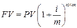 Следует отметить, что сложный процент может начисляться несколько раз в пределах одного года. Если m-количество раз начисления сложного процента в течение года, тогда будущая стоимость FV депозита PV при ставке процента і после n лет составляет: