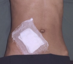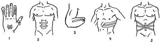 Пластырная повязка (рис.31) применяется при небольших или наглухо зашитых ранах (рис.31.3), фурункулах, для сближения краев гранулирующих ран, при переломе ребер (рис.31.4), а также после вправления пупочных грыж (рис. 31.5). Накладывают пластырную повязку с катушки липкого пластыря после ее разматывания или бактерицидным липким пластырем после снятия с него защитной пленки. Пластырь накладывают липкой стороной непосредственно на небольшие раны, ссадины, царапины после их обработки спиртовым раствором антисептика или поверх перевязочного материала полосками различной формы (рис.31.1). Полоски должны захватывать участки кожи в окружности перевязочного материала.
