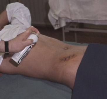 Пленкообразующие аэрозоли (рис. 33 ) применяются для защиты ссадин, ожоговой поверхности, операционных швов. Пленка снимается салфеткой, смоченной раствором эфира. К таким аэрозолям относятся буметол, пантенол, лифузоль и др. Аэрозоль полимера распыляют на рану и окружающую кожу с расстояния 15—20 см от покрываемой поверхности. Через несколько секунд после испарения растворителя образуется защитная, непроницаемая для жидкости, прозрачная пленка. Распыление повторяют 3—5 раз с интервалами, необходимыми для полного высыхания предыдущего слоя. Такие повязки показаны только при отсутствии значительного количества раневого отделяемого. Операционные раны, зашитые наглухо, покрывают защитной пленкой без всякой другой повязки. Если раневое отделяемое отслаивает пленку в виде пузырей, то они могут быть срезаны, экссудат удален и распыление полимера произведено вновь. Через 7—10 дней пленка сама отходит от кожи. При необходимости снять ее раньше пользуются тампонами, смоченными эфиром. Преимущества пленочных покрытий — эластичность при одновременной прочности, возможность наблюдения через пленку за состоянием раны, отсутствие неприятных ощущений стягивания, раздражения кожи, непроницаемость для проникновения возбудителей вторичной инфекции.