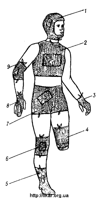 Рис. 36. Некоторые варианты накладывания трикотажных сетчатых повязок на отдельные части тела: 1 — на голову; 2 — на грудную клетку; 3 и 8 — на кисть; 4 — на культю; 5 — на стону; 6 — на область коленного сустава; 7 — на тазовую область и ягодицы; 9 — на область локтевого сустава.