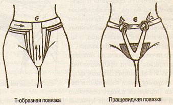 Т-образная повязка (рис.37). Основное назначение этой повязки - раны, воспалительные процессы в области промежности (операции на прямой кишке, крестце, вскрытие парапроктита и др.). Использование клеевых повязок при такой локализации невозможны, а бинтовые повязки требуют отличного знания техники их выполнения. Т-образная повязка — полоска материи или бинта, к середине которой пришита или через нее перекинута другая полоска. Горизонтальная часть фиксируется вокруг талии, а вертикальная — проходит через промежность и завязывается или прикрепляется булавками к первой полоске.