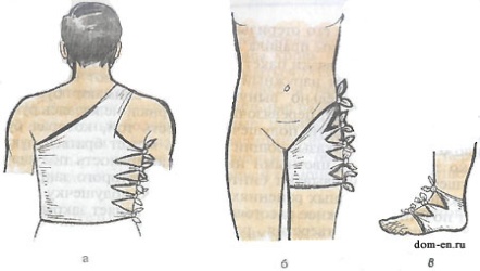 Рис. 34 Косыночная повязка на правую молочную железу (а), на голень (б), для поддержки руки (в).