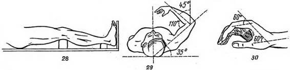 3. Бинтуемая часть конечности должна находится в средне-физиологическом положении, при этом положении мышцы максимально расслаблены. Для плечевого сустава – это слегка отведенное положение плеча, для локтевого сустава – согнутое под прямым углом предплечье. Область тазобедренного сустава бинтуют при выпрямленном положении конечности, коленного сустава - конечность слегка согнута в суставе, голеностопного сустава – стопа устанавливается под углом 90 градусов к голени (рис. 43).