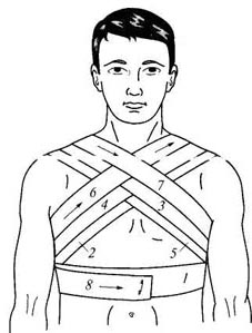 Крестообразная повязка на грудную клетку (Рис. 51). Повязку применяют при лечении заболеваний и повреждений грудной клетки.