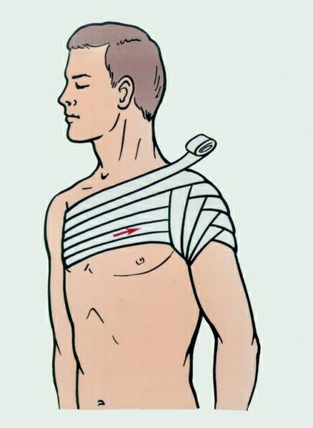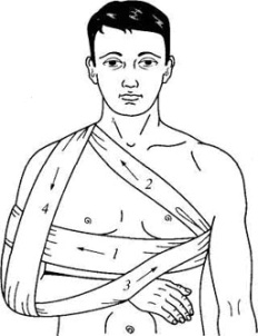 Повязка Дезо (Рис. 52). Повязку применяют для фиксации верхней конечности при переломах и вывихах плеча и ключицы, фиксирующая плечо и предплечье к туловищу и создающая тягу за плечевой сустав и дистальный отломок ключицы с помощью ватного валика, помещённого в подмышечной области. Разработана и названа по имени французского хирурга Пьера Дезо (1744—1795).