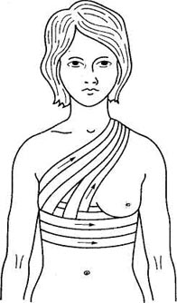 Спиральная повязка на грудную клетку (рис.50). Повязку применяют при лечении заболеваний и повреждений грудной клетки. Отрезают полосу бинта длиной около 2 м, кладут ее на надплечье так, чтобы один конец был спереди, а другой сзади. Круговыми восходящими ходами бинта с перекрытием предыдущих туров на 1/2 ширины забинтовывают грудную клетку до подмышечной впадины, а конец бинта закрепляют к повязке. Свободные концы свисающей полосы завязывают на противоположном надплечье.