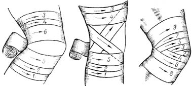 Восьмиобразная повязка на коленный сустав. На согнутый коленный сустав накладывают «черепашью» повязку. Разогнутый коленный сустав можно забинтовать обычной спиральной или восьмиобразной повязкой с перекрестом в области надколенника и расположением горизонтальных петель на задней поверхности нижней трети бедра и верхней трети голени.