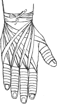 основанию поврежденного пальца и поднимают к кончику; спиральными ходами бинтуют палец в направлении от кончика к основанию; переводят бинт через тыл кисти к лучезапястному суставу и закрепляют несколькими циркулярными турами.