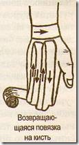 Первый тур бинта продольно направляют от нижней трети предплечья на тыльную поверхность кисти и, огибая пальцы, переводят на ладонь. Далее бинт доводят до запястья, перегибают и делают возвращающийся ход снова через ладонь и пальцы на тыл кисти. Несколькими возвращающимися турами бинта полностью закрывают пальцы, повязку заканчивают спиральными восходящими оборотами бинта от пальцев на кисть с закреплением на предплечье круговыми ходами.