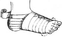 Над голеностопным суставом делают закрепляющий тур бинта, затем несколькими ходами бинта по боковым поверхностям стопы от пятки к большому пальцу закрывают пальцы стопы. Спиральными ходами бинта от пальцев стопы до пятки закрывают всю стопу, повязку заканчивают циркулярным ходом бинта вокруг голеностопного сустава.