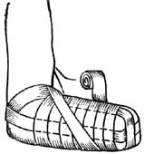Повязка на всю стопу (Рис. 59) Повязка применяется при лечении травм и заболеваний пальцев и всей стопы. Повязку на пальцы стопы, как и на пальцы кисти, накладывают по типу возвращающейся с закреплением ее круговыми ходами бинта. На всю стопу с пальцами также накладывают возвращающуюся повязку.