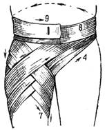 Повязки на промежность. Наложение Т-образной повязки на промежность. Повязку применяют при лечении повреждений и заболеваний области заднего прохода и промежности. Накладывают поясок-держалку, который завязывают вокруг талии. Прочной держалка получается из двух-трех горизонтальных туров бинта. К пояску посередине привязывают начало бинта и, проводя его через промежность, выводят под поясок с противоположной стороны. Сделав петлю вокруг пояска, бинт направляют прежним путем обратно. Вертикальные возвращающиеся туры бинта позволяют надежно закрепить перевязочный материал в промежности. У мужчин при бинтовании области заднего прохода вертикальные туры бинта спереди перекидывают через поясок не в одном месте, а в двух, оставляя половые органы в промежутке между расходящимися кпереди от заднего прохода вертикальными ходами бинта.