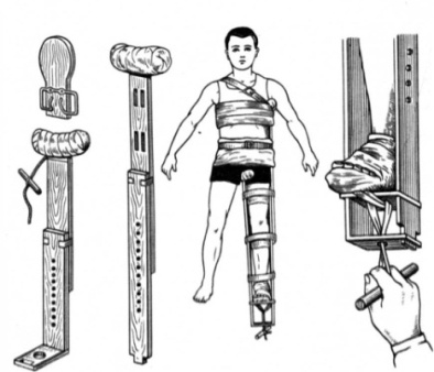 Другим видом лечебной иммобилизации является вытяжение, которое устраняет смещение костных фрагментов и фиксирует их в достигнутом положении на срок, необходимый для сращения перелома. Недостаток этого способа обездвижения — длительный срок пребывания больного в постели. С этой целью применяется шина Беллера (рис.61)