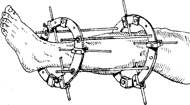 К методам лечебной иммобилизации относится и быстро развивающийся метод компрессионно-дистракционного остеосинтеза (при помощи аппарата Илизмрова)(рис.62).