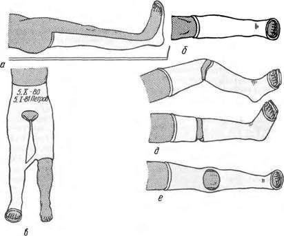 а—гипсовая лонгета; б — циркулярная гипсовая повязка; в — кокситная гипсовая повязка (с маркировкой); д — редрессируюшая повязка для устранения контрактур; е — мостовидная гипсовая повязка. ж-торакобрахиальная.