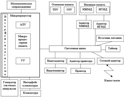 Микропроцессор (МП). Центральный блок ПК, предназначен для управления всеми блоками машины и для выполнения арифметических и логических операций над данными. В состав МП входит:
