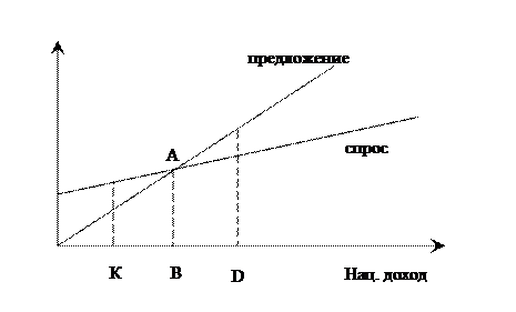 Главным инструментом достижения равновесия считаются не цены (т.к. они не являются абсолютно свободными вследствие монополистических тенденций, долгосрочных контрактов и деятельности профсоюзов), а объем продаж, учитывающий не только цену, но и количество производимой продукции (на макроуровне это – национальный доход). На графике представлена зависимость между национальным доходом и совокупными величинами спроса и предложения. В точке А наблюдается равновесие между этими величинами.
