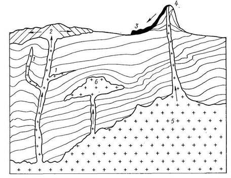 1 – жилы; 2 – покров; 3- поток; 4 – вулканический конус; 5 – батолит; 6 – лакколит