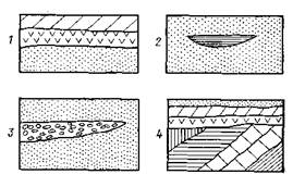 1 – нормальные слои; 2 – линза глины в песке; 3 – выклинивание галечника в песке;