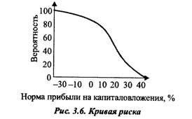 Из рис. 3.6 и табл. 3.1 видно, например, что вероятность получения прибыли на планируемые капитальные вложения составляет 78 %, а вероятность того, что они окажутся убыточными, равна 22 %. Имеется 5 шансов из 100, что норма прибыли составит 30-40 %.