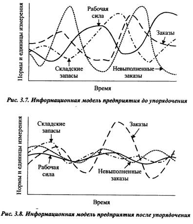 Форрестер в своей модели рассматривает фирму как электрическую схему и определяет информационную структуру предприятия, факторы, вызывающие запаздывание, величину запаздывания в каждом структурном звене, а также политику и прогнозы, которые ведут к усилению возмущающего воздействия. Подобная модель позволяет управляющим в ситуации, представленной графиком на рис. 3.7, достичь гораздо большей стабильности (рис. 3.8) в работе. Оба рисунка представляют в весьма упрощенном виде довольно сложные графики, построенные с помощью ЭВМ на основании динамической модели программного предприятия.