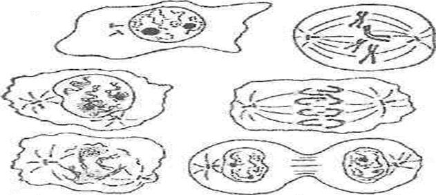 2) Митоз. Само разделение клеток может проходить по-разному. Прокариотические клетки делятся преимущественно путем простого, так называемого бинарного, деления. В этом варианте их нуклеоид удваивается путем репликации, и новая копия прикрепляется к клеточной мембране, после чего между двумя нуклеинами формируется новая клеточная стенка. Интерфазы между делениями прокариотичных клеток занимают небольшие промежутки времени. Большинству бактерий для подготовки деления хватает около двадцати минут. У эукариот процесс деления, как и интерфаза, длится дольше. Процессы, какие происходят во время разделения, у них более сложные через наличие ядра и наследственного материала в виде хромосом. В большинстве случаев деление эукариотических клеток представлено в форме митоза или мейоза. Типичный митоз состоит из четырех основных фаз: профазы, метафазы, анафазы и телофазы.