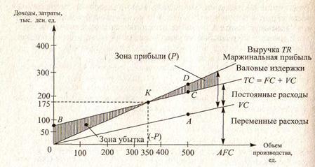 Проекция точки К на ось ординат дает критический объем производства в стоимостном измерении.