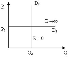 На этом графике показаны крайние противоположные варианты: кривая спроса D1 показывает абсолютно эластичный спрос, кривая D2 – абсолютно неэластичный спрос.