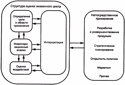 Рис. 15.2Стадии оценки жизненного цикла технологической деятельности. Стрелки обозначают основные потоки информации. На каждом этапе результаты интерпретируются, обеспечивая, таким образом, возможнocть корректировки экологических характеристик оцениваемой деятельности (Адаптировано из Society of Environmental Toxicology and Chemistry (SETAC), Guideliпes /or Life-Cycle Assessтeпt: А Code о/ Practice, Pensacola, FL, 1993.)