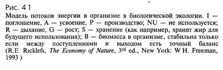 2. Биологический органцзм использует энергию и материальные ресурсы. Биологические организмы тратят энергию на переработку сырья в новые формы, пригодные для использования. Они также производят тепло из оставшихся после переработки материалов. Излишняя энергия выпускается биологическими организмами в окружающую среду, также как и остатки материалов (экскременты, урина, выдыхаемый воздух и т.д.). Поток энергии, проходящий через любой организм, представлен на рис. 4.1.
